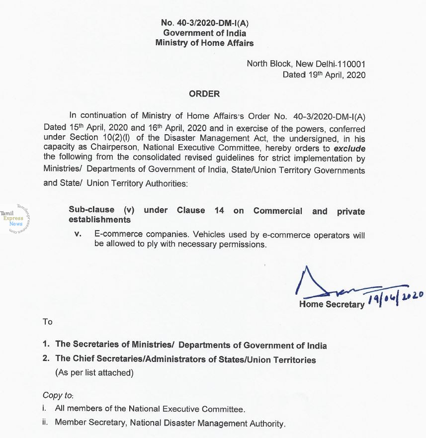 நாளை முதல் அத்தியாவசிய பொருட்களை ஆன்லைனில் விற்க மத்திய அரசு அனுமதி!