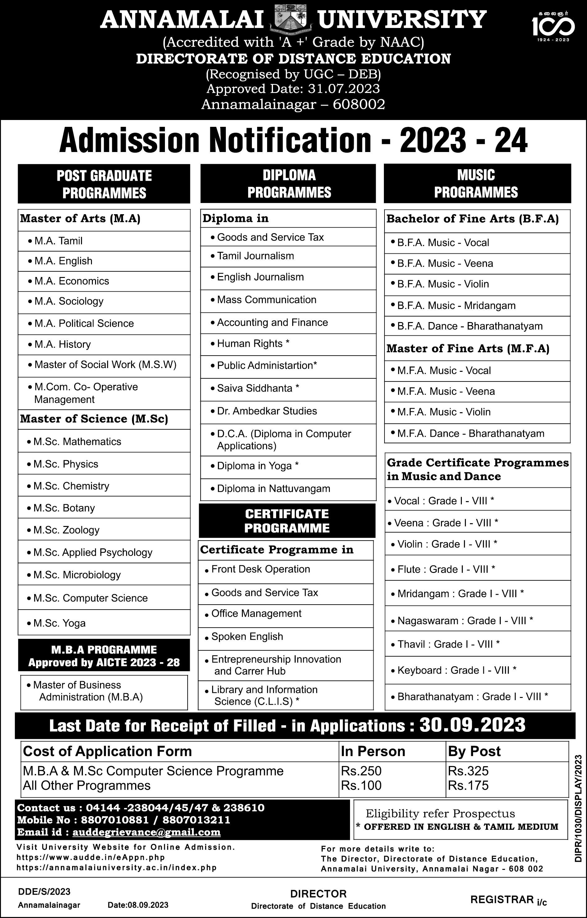 Annamalai University - Admission Notification 2023-2024 - Last Date - 30.09.23 CLICK HERE TO DOWNLOAD Admission Notification 2023-2024 PDF