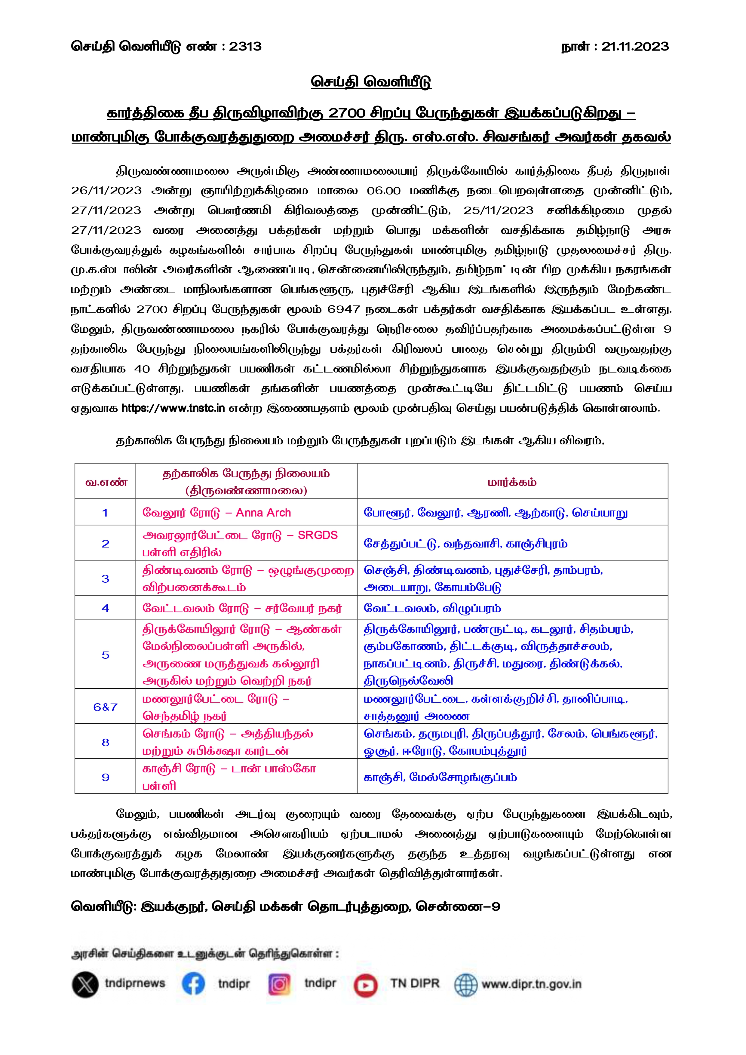 கார்த்திகை தீப திருவிழாவிற்கு 2700 சிறப்பு பேருந்துகள் இயக்கப்படுகிறது - மாண்புமிகு போக்குவரத்துதுறை அமைச்சர் திரு.எஸ்.எஸ்.சிவசங்கர் அவர்கள் தகவல் செய்தி வெளியீடு எண்: 2313