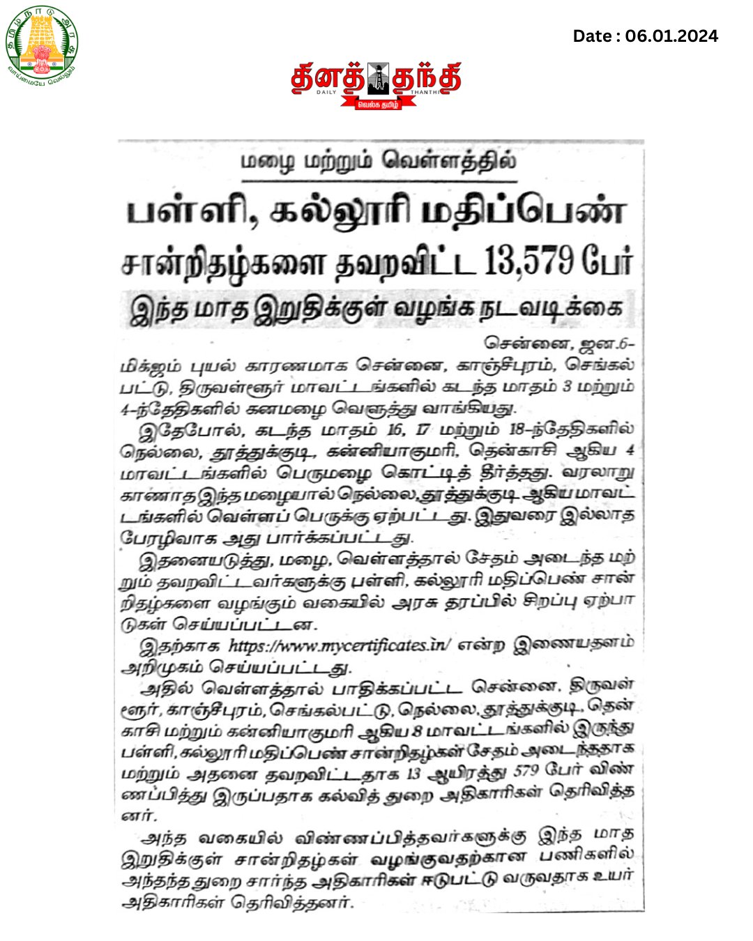 இதனையடுத்து, மழை, வெள்ளத்தால் சேதம் அடைந்த மற் றும் தவறவிட்டவர்களுக்கு பள்ளி, கல்லூரி மதிப்பெண் சான் றிதழ்களை வழங்கும் வகையில் அரசு தரப்பில் சிறப்பு ஏற்பா டுகள் செய்யப்பட்டன. ② https://www.mycertificates.in/ नखं அறிமுகம் செய்யப்பட்டது. அதில் வெள்ளத்தால் பாதிக்கப்பட்ட சென்னை, திருவள் ளூர், காஞ்சீபுரம், செங்கல்பட்டு, நெல்லை, தூத்துக்குடி, தென் காசி மற்றும் கன்னியாகுமரி ஆகிய 8 மாவட்டங்களில் இருந்து பள்ளி, கல்லூரி மதிப்பெண் சான்றிதழ்கள் சேதம் அடைந்ததாக மற்றும் அதனை தவறவிட்டதாக 13 ஆயிரத்து 579 பேர் விண் ணப்பித்து இருப்பதாக கல்வித் துறை அதிகாரிகள் தெரிவித்த