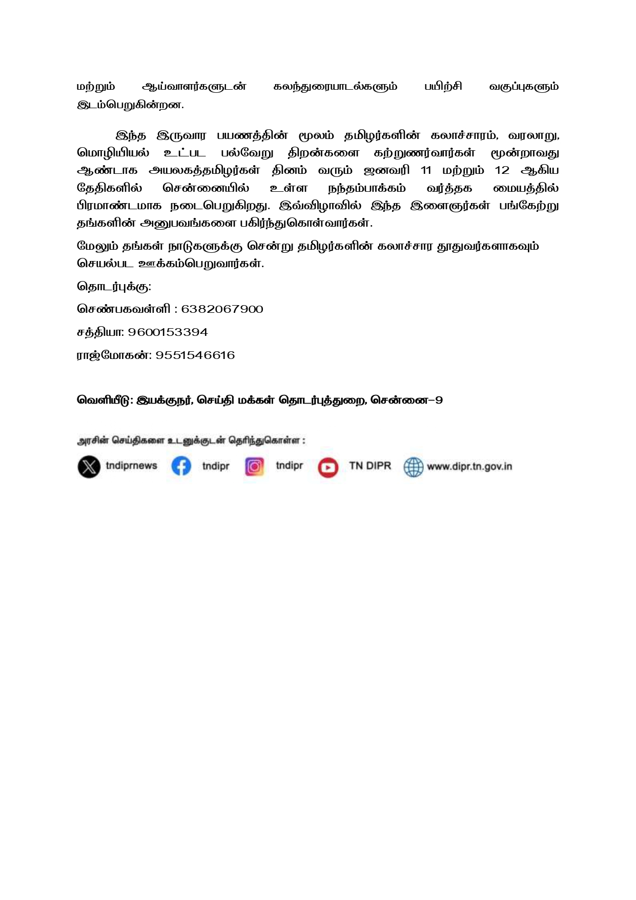 மேலும் தங்கள் நாடுகளுக்கு சென்று தமிழர்களின் கலாச்சார தூதுவர்களாகவும் செயல்பட ஊக்கம்பெறுவார்கள்.