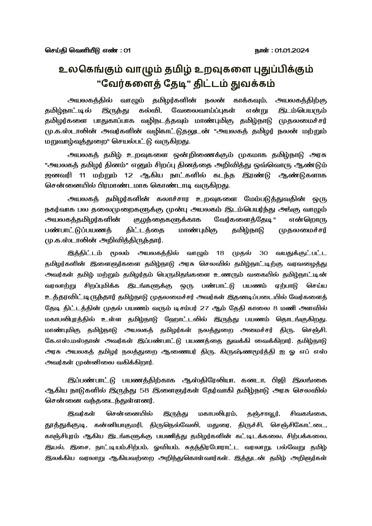 உலகெங்கும் வாழும் தமிழ் உறவுகளை புதுப்பிக்கும் "வேர்களைத் தேடி" திட்டம் துவக்கம். Inauguration of project "Looking for Roots" to renew Tamil ties around the world.