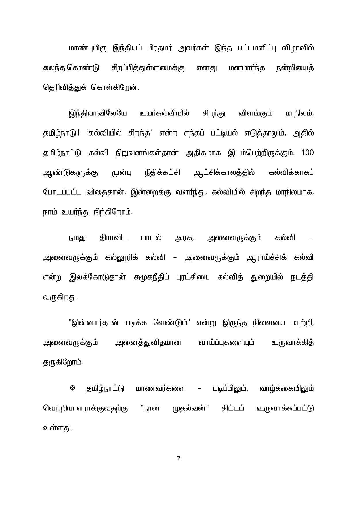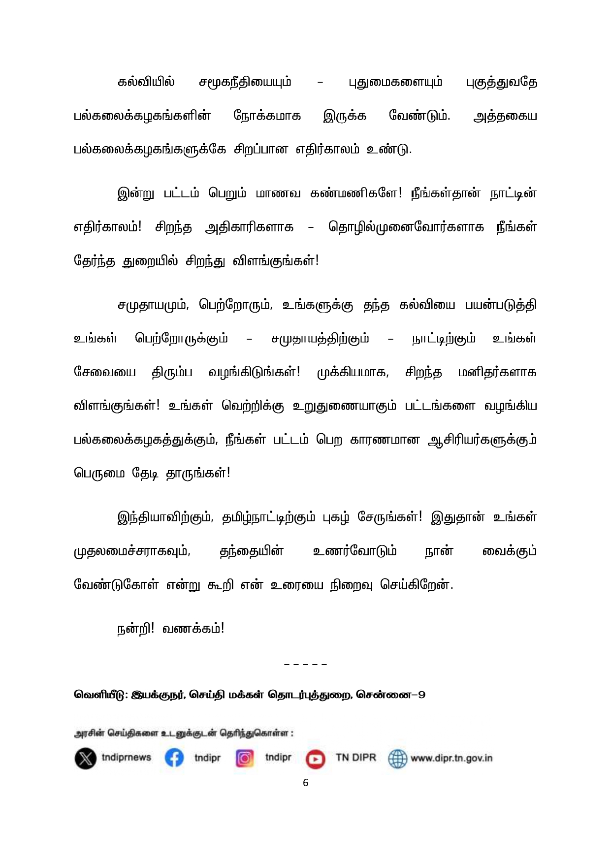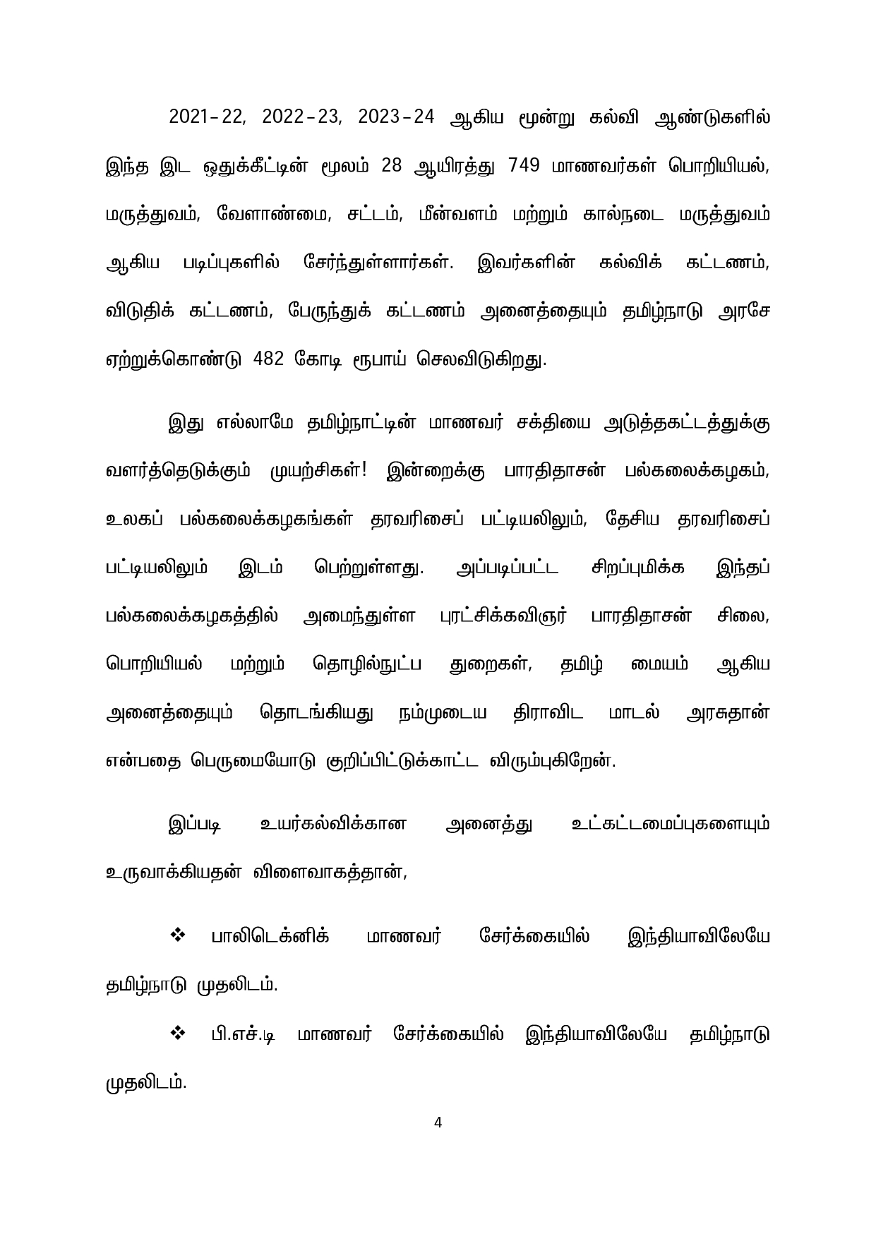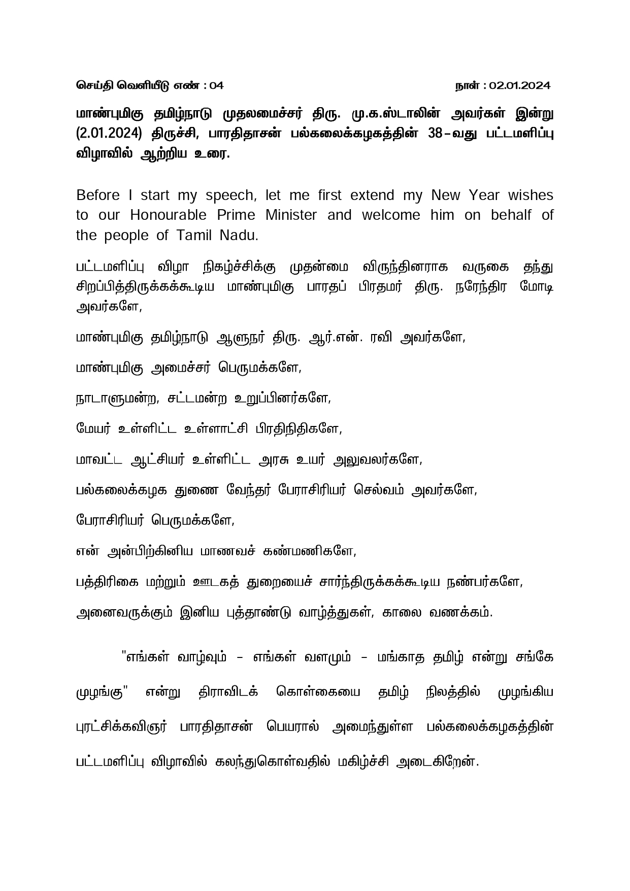மாண்புமிகு தமிழ்நாடு முதலமைச்சர் திரு. மு.க.ஸ்டாலின் அவர்கள் பாரதிதாசன் பல்கலைக்கழகத்தின் 38-வது பட்டமளிப்பு விழாவில் ஆற்றிய உரை.